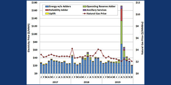 The report from Potomac Economics showed average real-time energy prices rose by 32% in 2019, despite a 23% reduction in natural gas prices. The Monitor attributed the increase to shortage pricing in August and September, when prices reached the offer cap of $9,000/MWh for more than two hours.