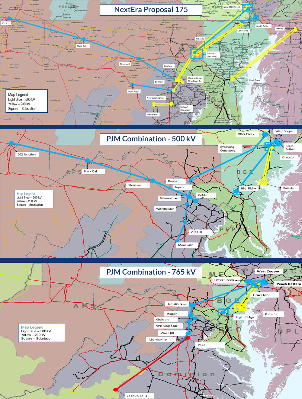One of the PJM plans would construct a 765-kV line between the Joshua Falls and Yeat substations, bringing power into Loudoun County from the south. Additional transmission capability would also be constructed to the northeast, tapping into the 500-kV grid at Peach Bottom.