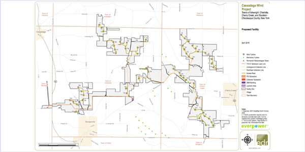 The Cassadaga Wind project will occupy about 77 acres in Chautauqua County and consist of up to 48 high-capacity, 500-foot-tall wind turbines. The wind farm would interconnect to the state’s electrical grid along the 115-kV Dunkirk-Moon transmission line.